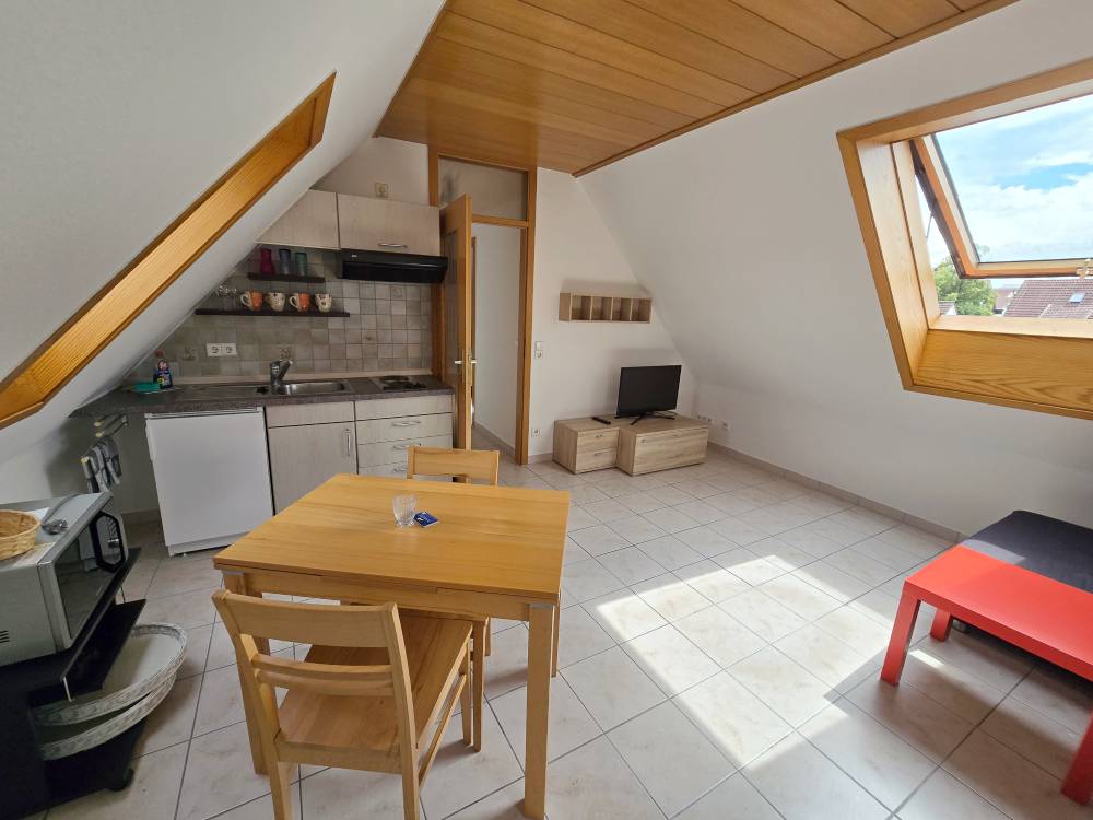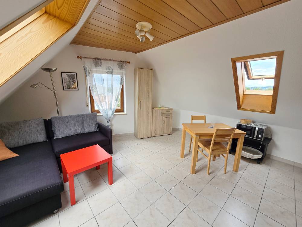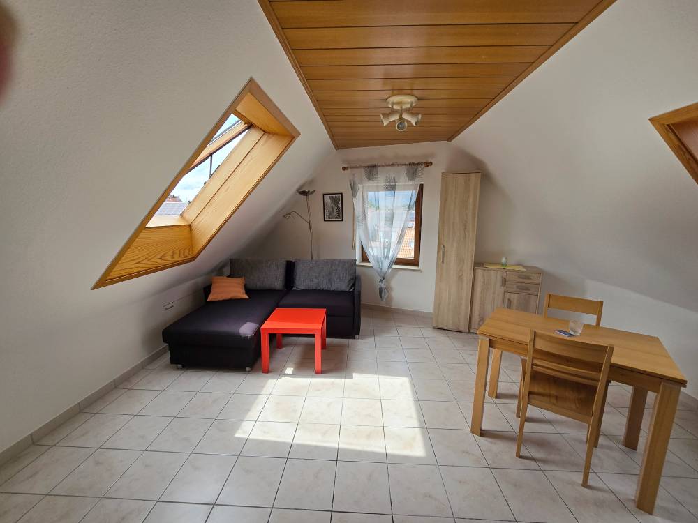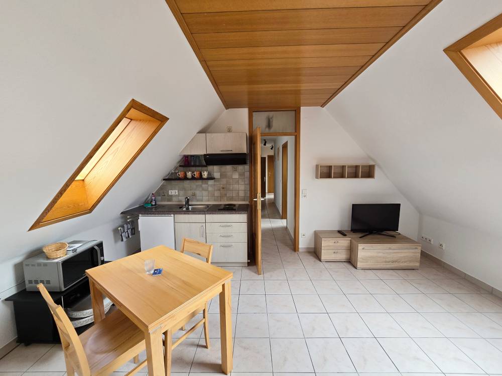 Helle 1,5-Zimmer-DG-Wohnung (ca. 46 m²) mit kl. Schlafzimmer mit Einzelbett, Schrank, Wohnzimmer mit Eckschlafcouch, Sideboard, Tisch u. Stühle, SAT-TV, Miniküche mit Grillmikrowelle, Bad m. Dusche / WC (Fußbodenheizung / Hotelsafe)