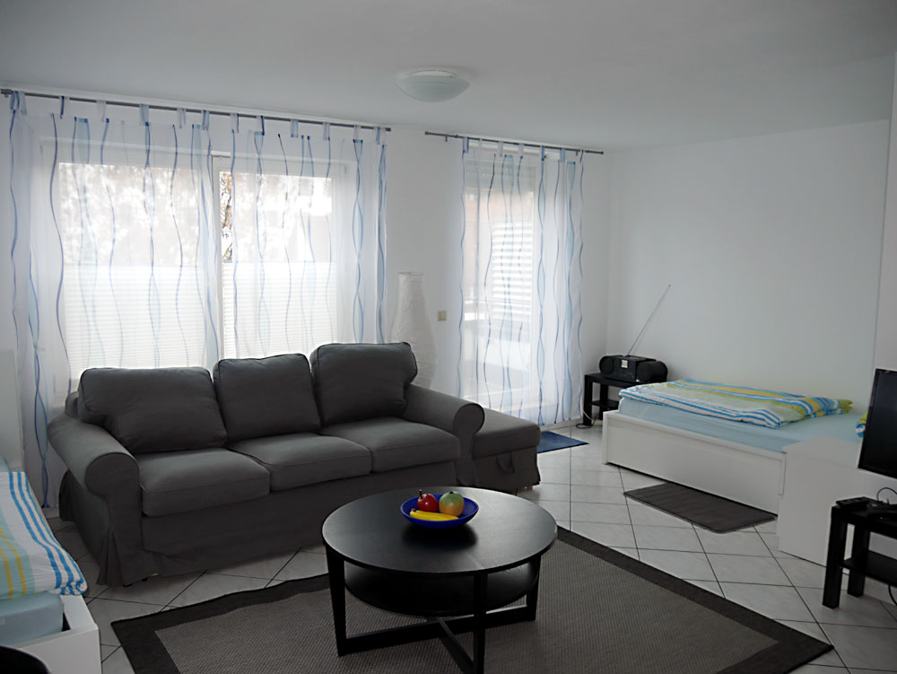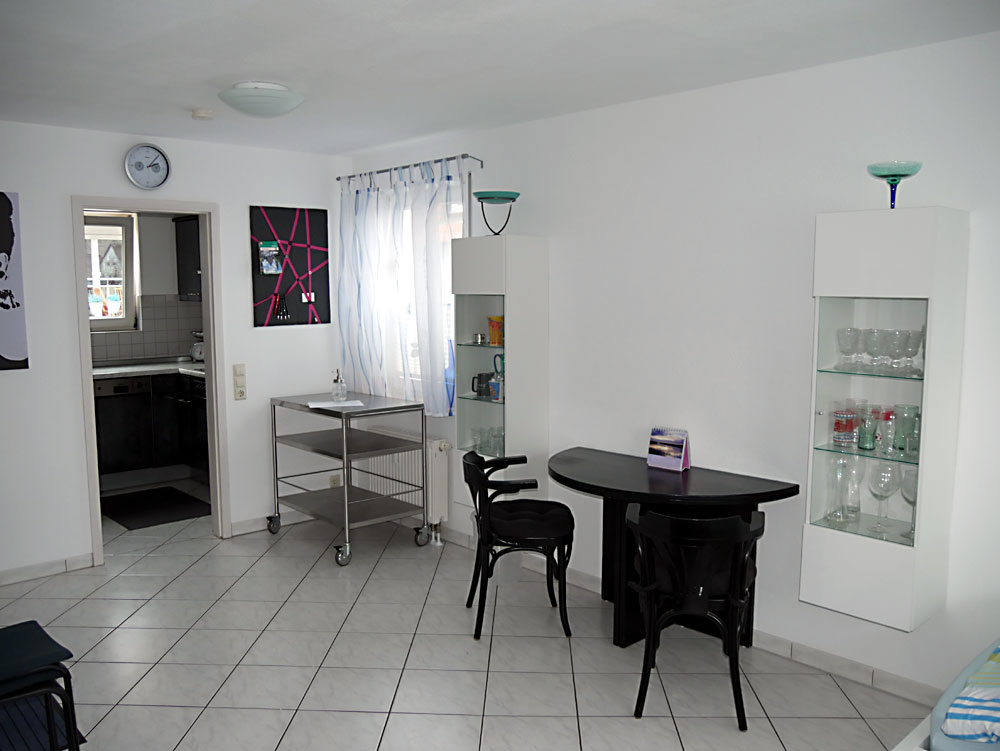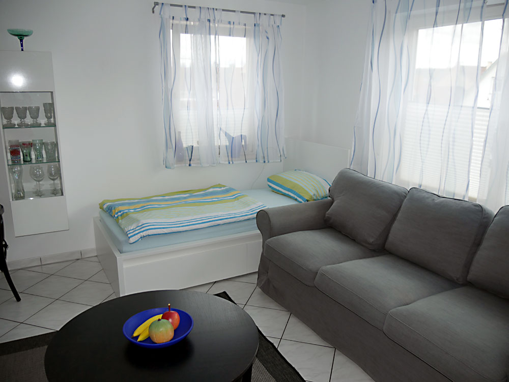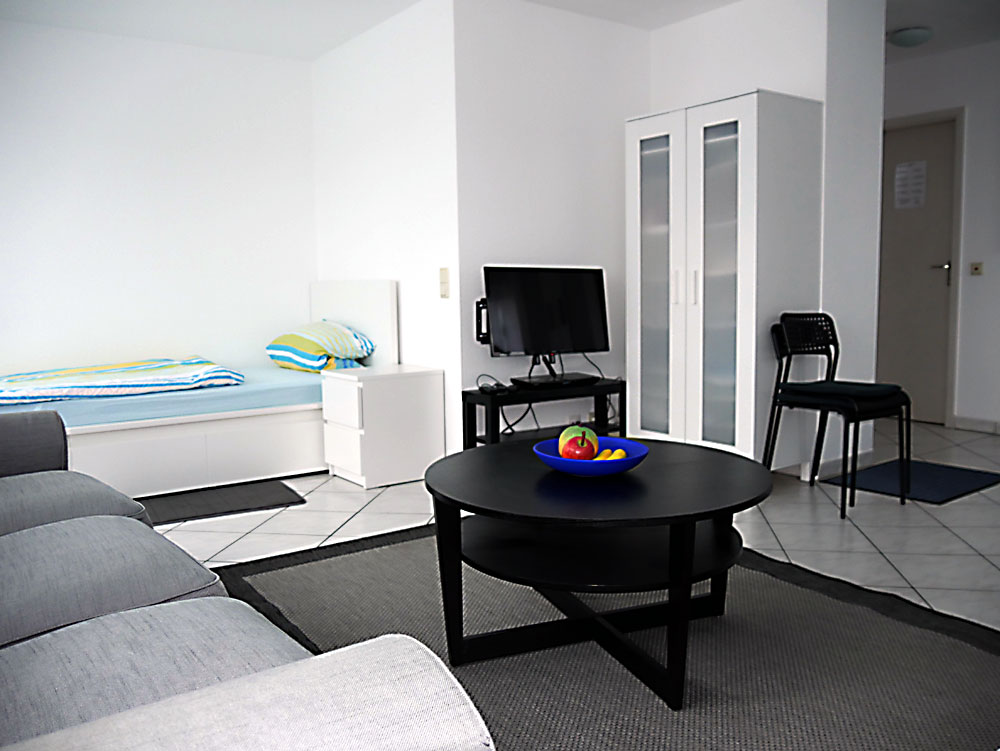 Sehr schöne, helle 1-Zimmerwohnung (ca. 40 m²) mit 2 Einzelbetten, Schrank, Schlafcouch u. Tisch, Esstisch u. Stühle, Kabel-TV, DVD-Player, Radio mit CD-Player, sep. Küche, Bad mit Badewanne / WC, Balkon (WLAN)