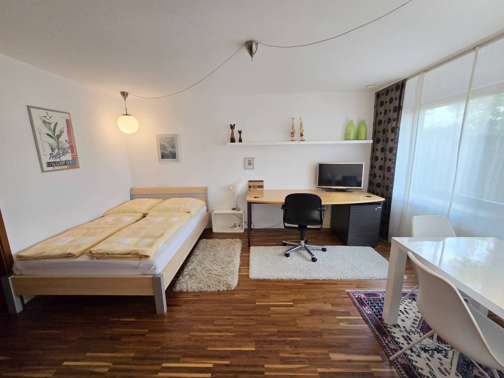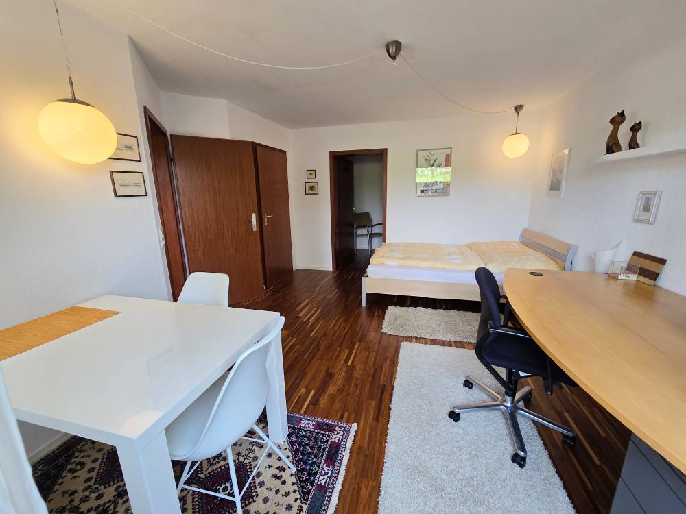 Helle 1,5-Zimmereinliegerwohnung (ca. 36 m²) mit Doppelbett (1,40 m), Esstisch u. Stühle, Schreibtisch, Kabel-TV, Schrank-/Ankleidezimmer, kleine Küche, Bad mit Dusche / WC, Terrasse (WLAN)