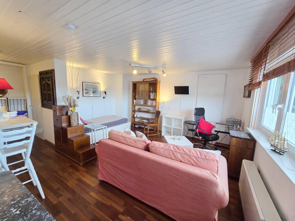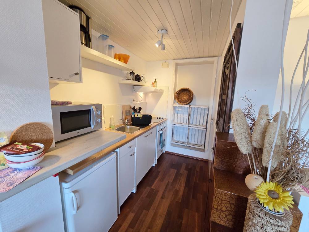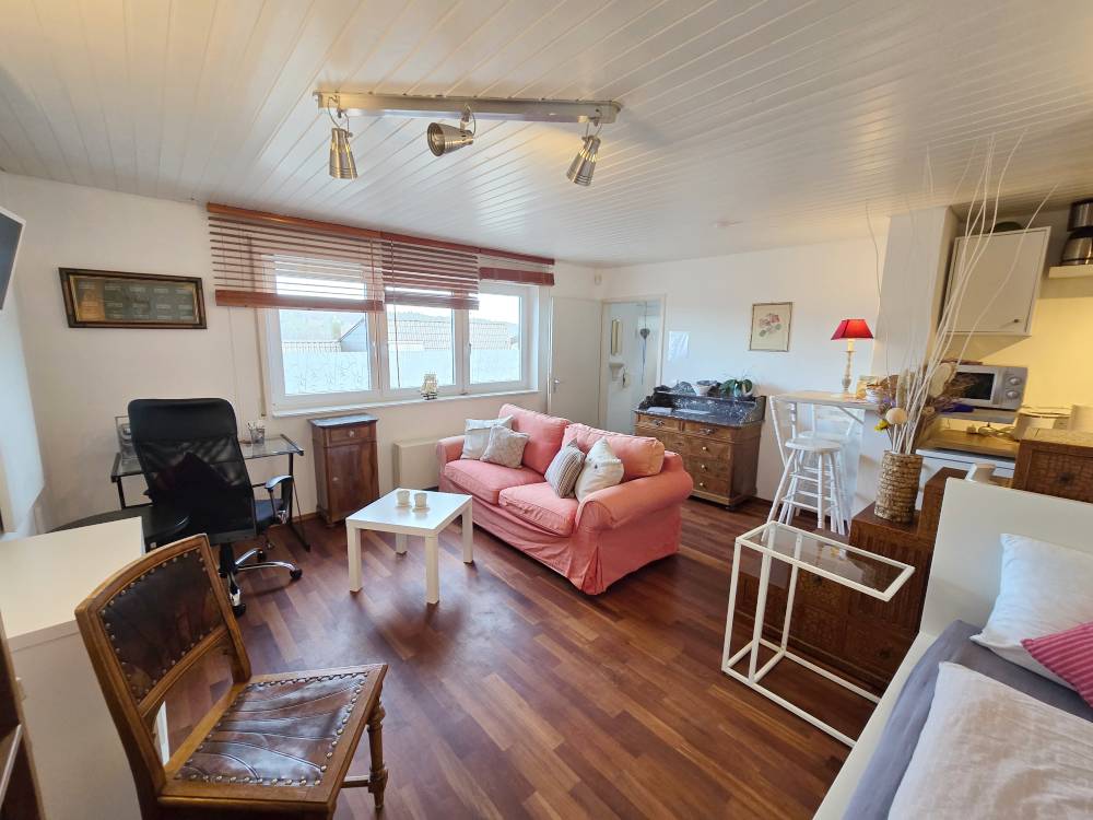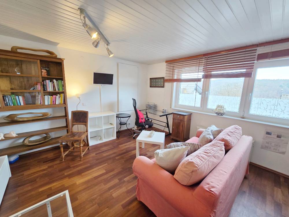 Helle 1-Zimmereinliegerwohnung (ca, 27 m²) mit Einzelbett, Regal, Kommode, Couch u. Tisch, SAT-TV, Schreibtisch + Bürostuhl, offene Küche mit kl. Esstheke, Bad mit Dusche/WC, Außensitzplatz, Pkw-Stellplatz