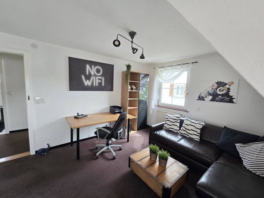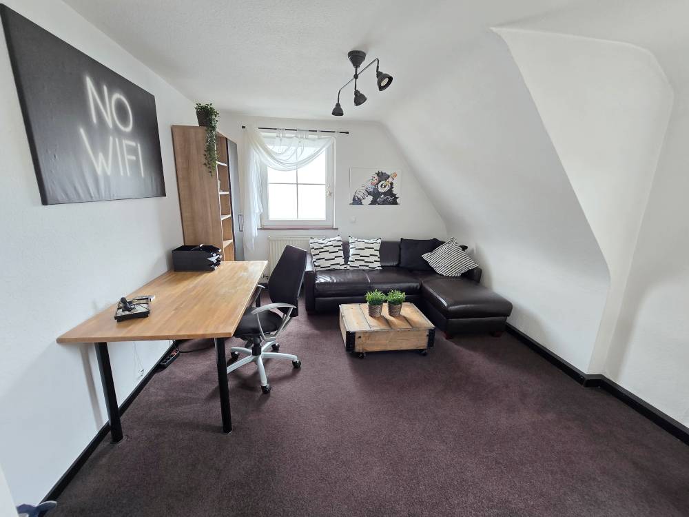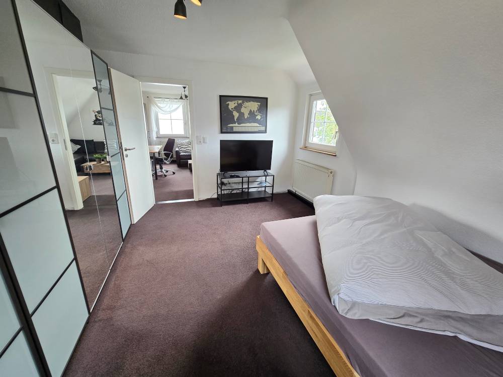 Gemütliche 2-Zimmer-DG-Wohnung (ca. 50 m²) mit Schlafzimmer mit franz. Bett (1,60 m), Schrank, Sideboard, Flat-TV, Wohnzimmer mit Lederschlafcouch, Schreibtisch, Sideboard, Küche mit Esstisch und Stühlen, Bad mit Badewanne, sep. WC /(WLAN)