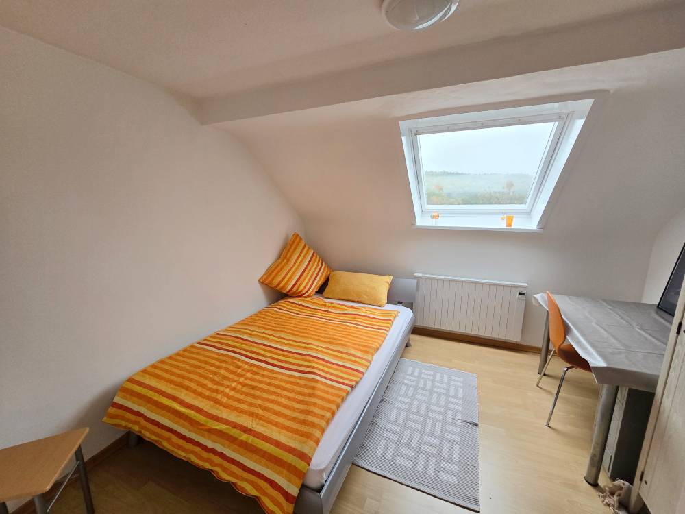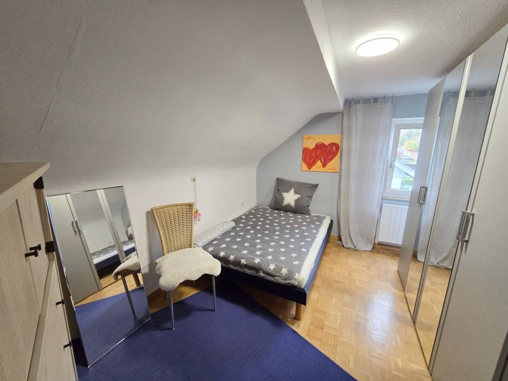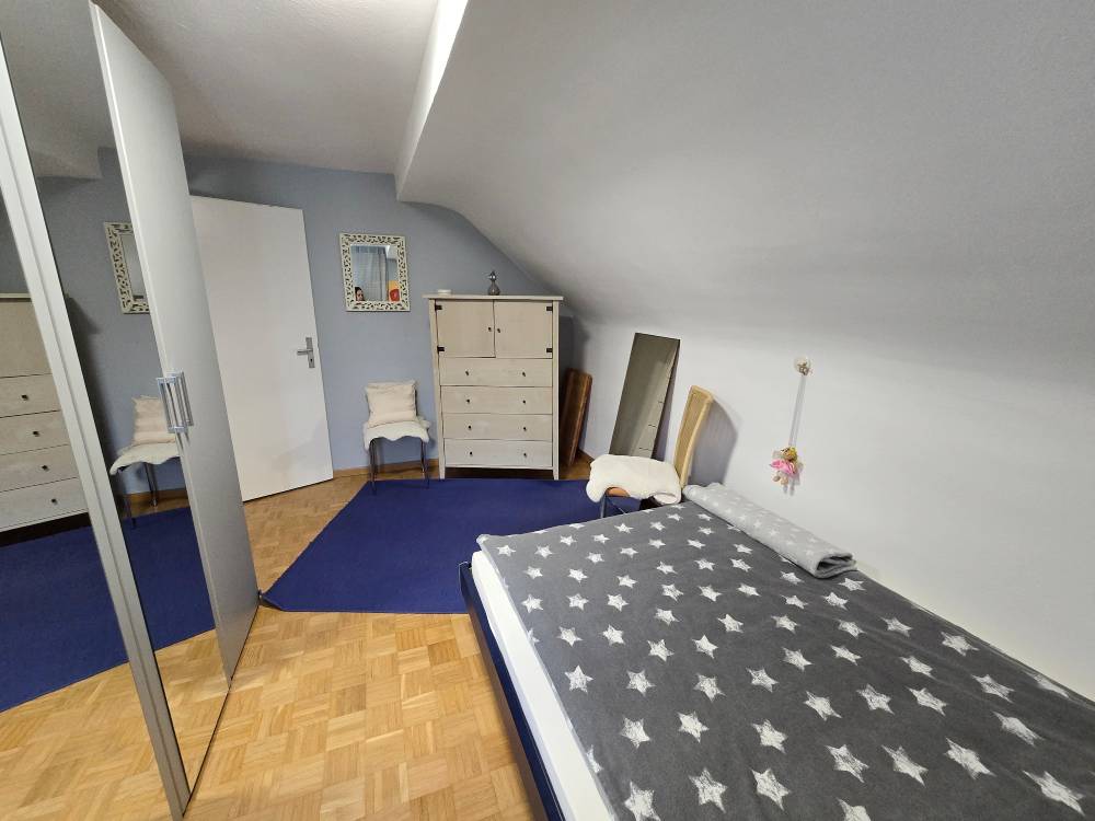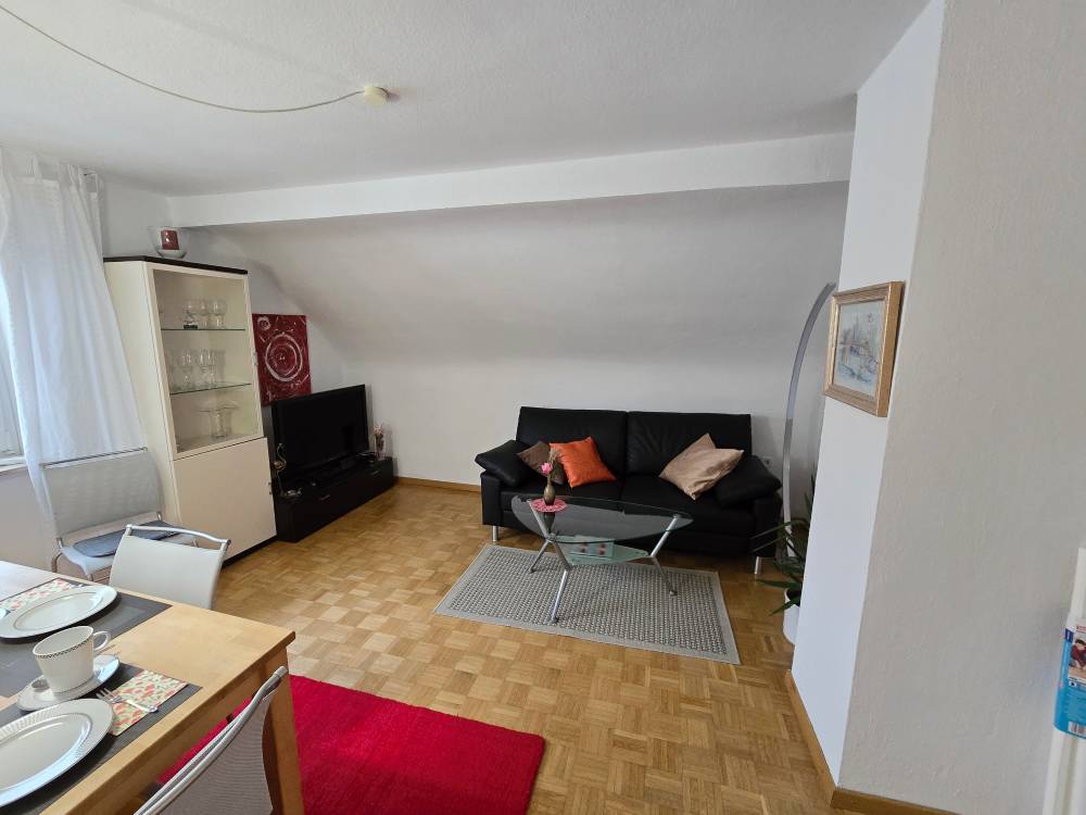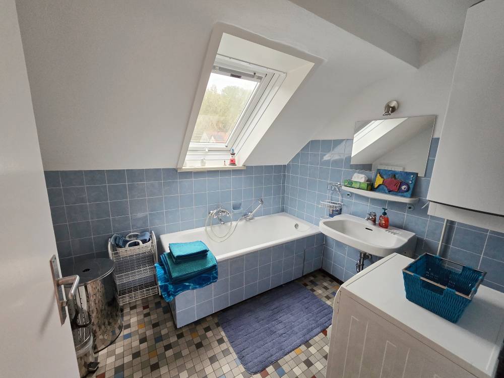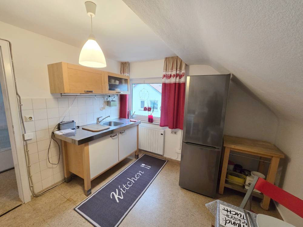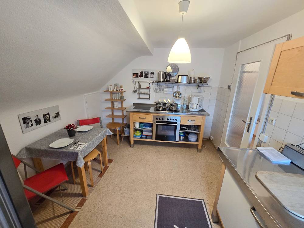Helle 3-Zimmer-DG-Wohnung (60 m“) mit 2 Schlafzimmer mit franz. Bett (1,40 m), Schrank, Tisch, Kommode, Wohnzimmer mit Couch, Sideboard, SAT-TV, Esstisch u. Stühle, Küche m. Esstisch u. Stühle, Bad mit Badewanne, sep. WC (WLAN)
