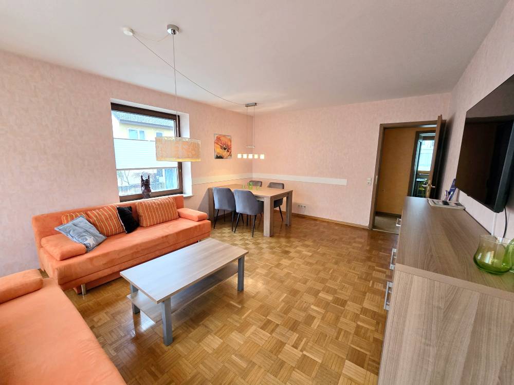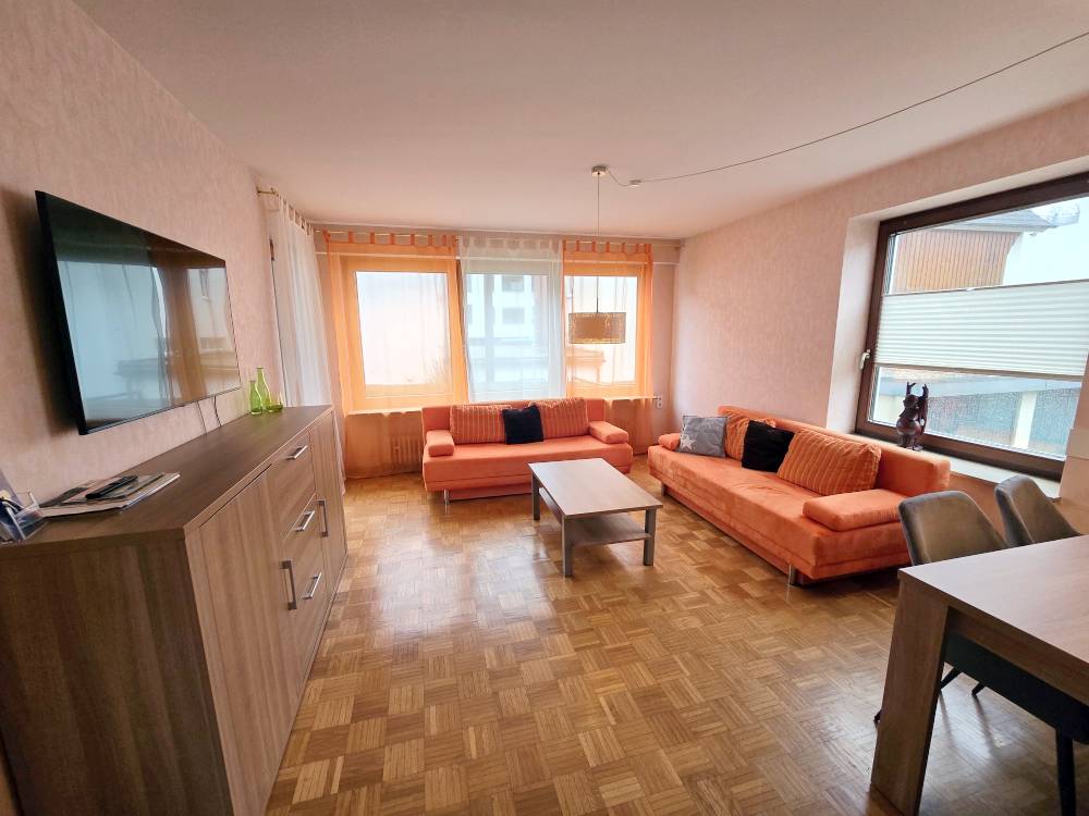 Helle 3-Zimmerwohnung (ca. 75 m²) mit 2 Schlafzimmer mit je 2 Einzelbetten und Schrank, Wohnzimmer mit 2 Schlafsofas und Couchtisch, Esstisch u. Stühle, Kabel-TV, DVD-Player, Küche mit kl. Tisch, Bad m. Badewanne u. Dusche, sep. WC, gr. Balkon (WLAN)